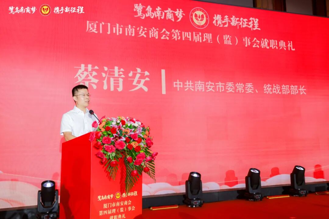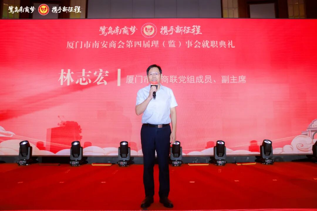 他表示,家乡南安新一轮高质量发展其时已至、其势已成,这里的每一寸土地都跃动着无限机遇。希望厦门市南安商会能以此次换届为新的起点,继续做凝聚乡情的“连心桥”,让更多乡亲在这里感受到家的温暖,互帮互助、携手前行;继续做赋能发展的“助推器”,帮助会员企业把握时代脉搏,把企业做大做强,让“南商力量”闪耀世界舞台。衷心期待大家常回家看看,亲身感受家乡发展的澎湃脉动,积极帮助家乡牵线搭桥,带动吸引更多客商、社会各界朋友来南参观考察、投资兴业,推动两地实现双向奔赴、共赢发展。市委、市政府也将持续优化营商环境,为每一位回乡的企业家,提供最贴心的服务、最坚实的保障、最广阔的舞台,让大家在家乡的沃土中扎根生长、枝繁叶茂。
